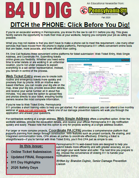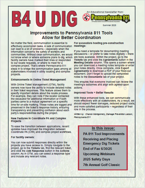The Pennsylvania 811 Board of Directors have mandated that effective April 21, 2023, all Preliminary and Final Design Notifications must be created in Pennsylvania 811's Coordinate PA (CPA) Application.
